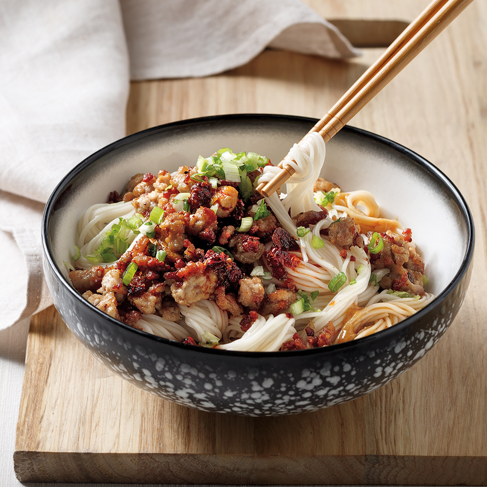 - Dans quatre bols, répartir la sauce réservée. Déposer les nouilles de blé dans les bols, puis le porc haché. Si désiré, garnir de légumes fermentés. Napper d’huile infusée aux piments chili croustillants et parsemer d’oignons verts.